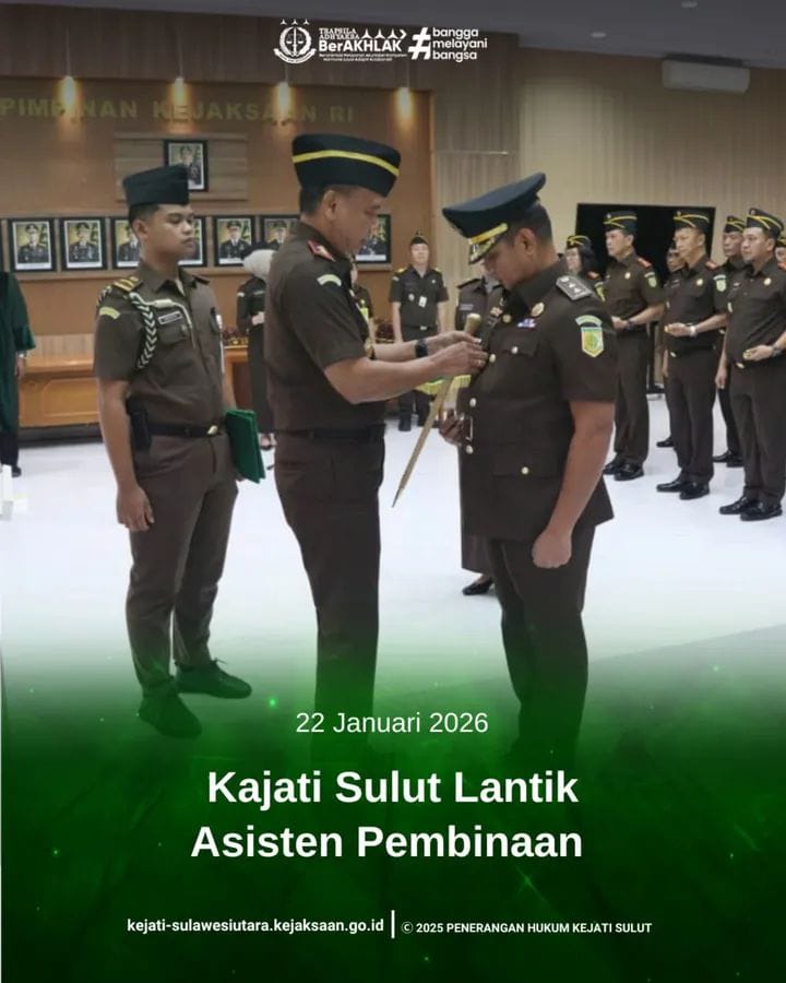 MANADO, Lintashukrimindonesia.com — Kepala Kejaksaan Tinggi Sulawesi Utara (Kejati Sulut) Jacob Hendrik Pattipeilohy, S.H., M.H. secara resmi melantik Fahri, S.H., M.H. sebagai Asisten Pembinaan Kejaksaan Tinggi Sulawesi Utara. Pelantikan tersebut merupakan bagian dari mekanisme organisasi Kejaksaan Republik Indonesia dalam rangka penguatan tata kelola internal serta optimalisasi pelaksanaan tugas kelembagaan.