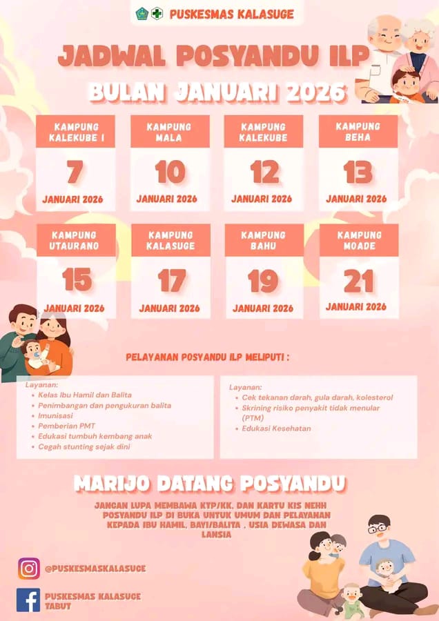 Tabukan Utara, Lintashukrimindonesia.com – Memasuki minggu pertama di tahun 2026, Puskesmas Kalasuge secara resmi merilis Jadwal Posyandu Integrasi Layanan Primer (ILP) untuk bulan Januari.