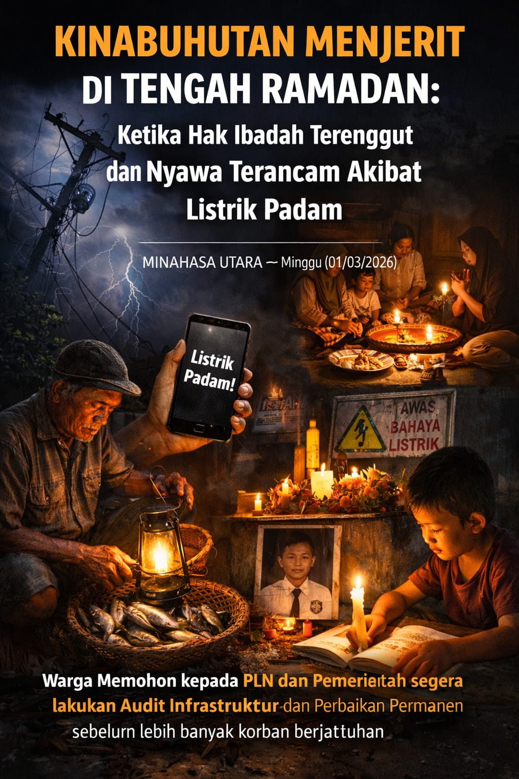 MINAHASA UTARA, Lintashukrimindonesia.com — Gangguan listrik yang terus berulang di Desa Kinabuhutan, Minahasa Utara, kini tidak lagi dapat dipandang sebagai sekadar persoalan teknis. Di tengah momentum bulan suci Ramadan — saat masyarakat seharusnya beribadah dengan tenang dan khusyuk — kondisi listrik yang hidup-mati bahkan padam total telah mengganggu pelaksanaan puasa warga secara signifikan.Minggu (01/03/2026)