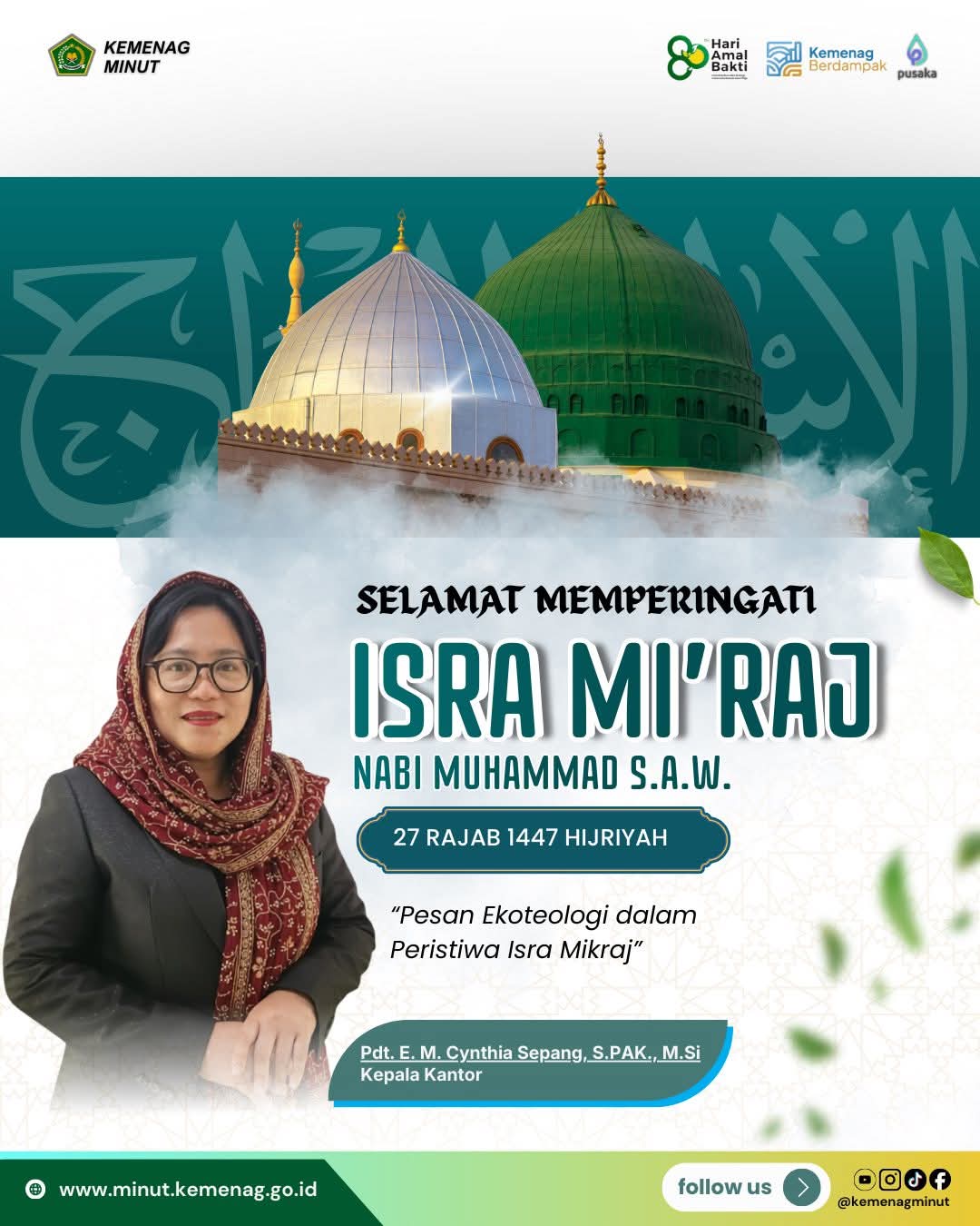 Minahasa Utara, Lintashukrimindonesia.com –  Kepala Kantor Kementerian Agama Kabupaten Minahasa Utara, Pdt. E. M. Cynthia Sepang, S.PAK., M.Si, bersama seluruh jajaran menyampaikan ucapan Selamat Memperingati Isra Mikraj Nabi Muhammad SAW 1447 Hijriah kepada seluruh umat Islam, khususnya di Kabupaten Minahasa Utara.