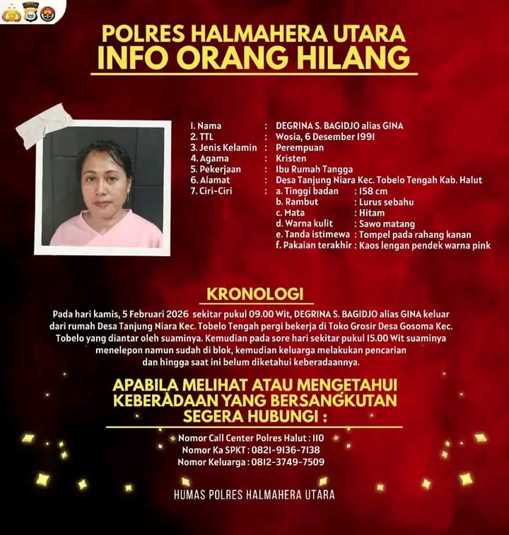 Berdasarkan keterangan resmi, Degrina S. Bagidjo dilaporkan hilang sejak Kamis, 5 Februari 2026. Yang bersangkutan terakhir kali terlihat keluar dari rumahnya di Desa Tanjung Niara, Kecamatan Tobelo Tengah, sekitar pukul 09.00 WIT.