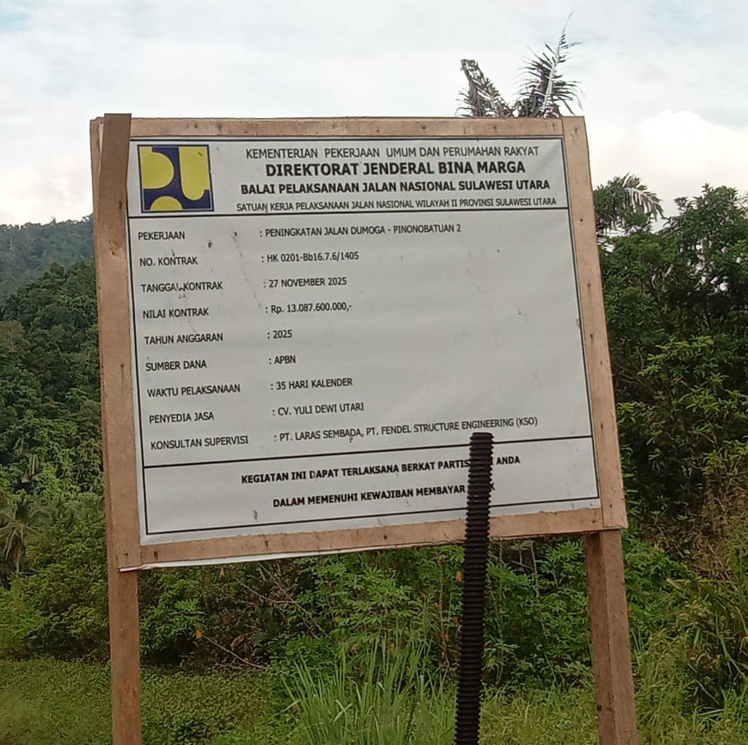 Sulawesi Utara, Lintashukrimindonesia.com– Proyek peningkatan jalan nasional di Sulawesi Utara yang didanai APBN senilai Rp13 miliar lebih kini terbengkalai. Paket pekerjaan ruas Dumoga-Pinonobatuan 2 yang dikerjakan oleh CV Yuli Dewi Utari hanya terealisasi sekitar 30%, padahal masa kontrak 35 hari kalender telah berakhir.