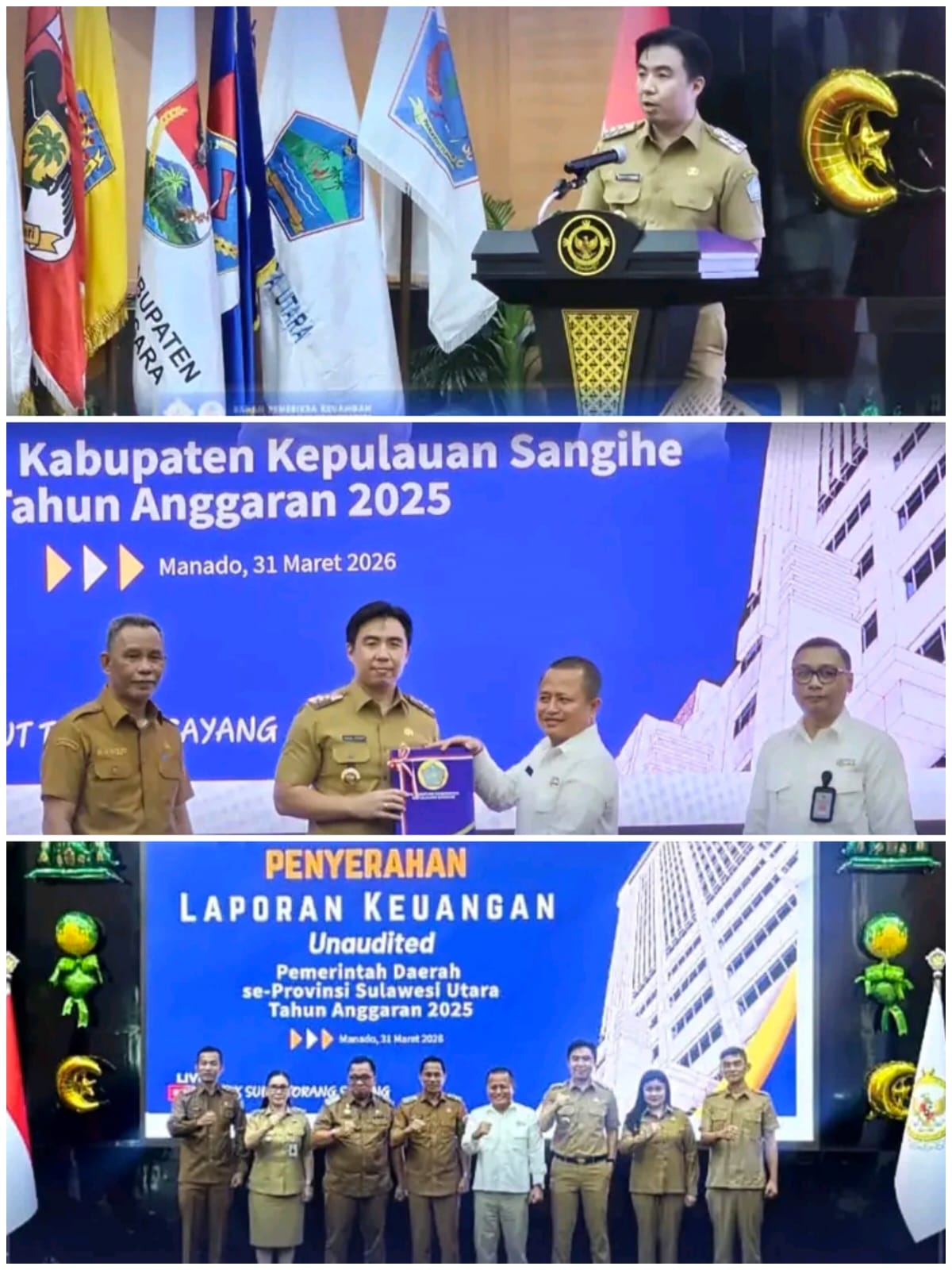 SANGIHE, lintashukrimindonesia.com – Bupati Kepulauan Sangihe, Michael Thungari, menghadiri penyerahan Laporan Keuangan Pemerintah Daerah (LKPD) Unaudited Tahun Anggaran 2025 di Kantor BPK RI Perwakilan Provinsi Sulawesi Utara, Selasa (31/3/2026).