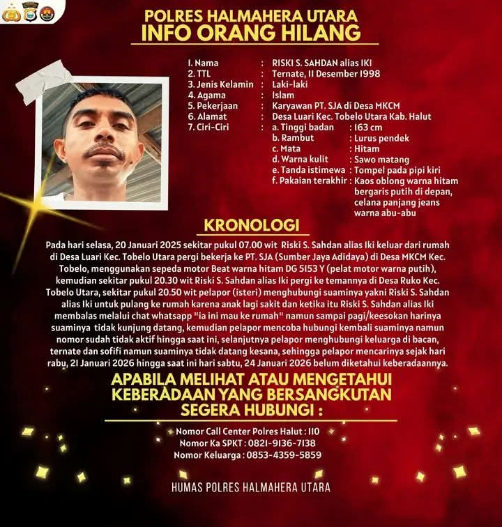 HALUT, Lintashukrimindonesia.com – Seorang warga Desa Luari, Kecamatan Tobelo Utara, Kabupaten Halmahera Utara, bernama Riski S. Sahdan alias Iki, dilaporkan hilang sejak Selasa, 20 Januari 2025 hingga saat ini belum diketahui keberadaannya. Pihak keluarga bersama aparat kepolisian terus melakukan upaya pencarian dan meminta bantuan masyarakat luas.